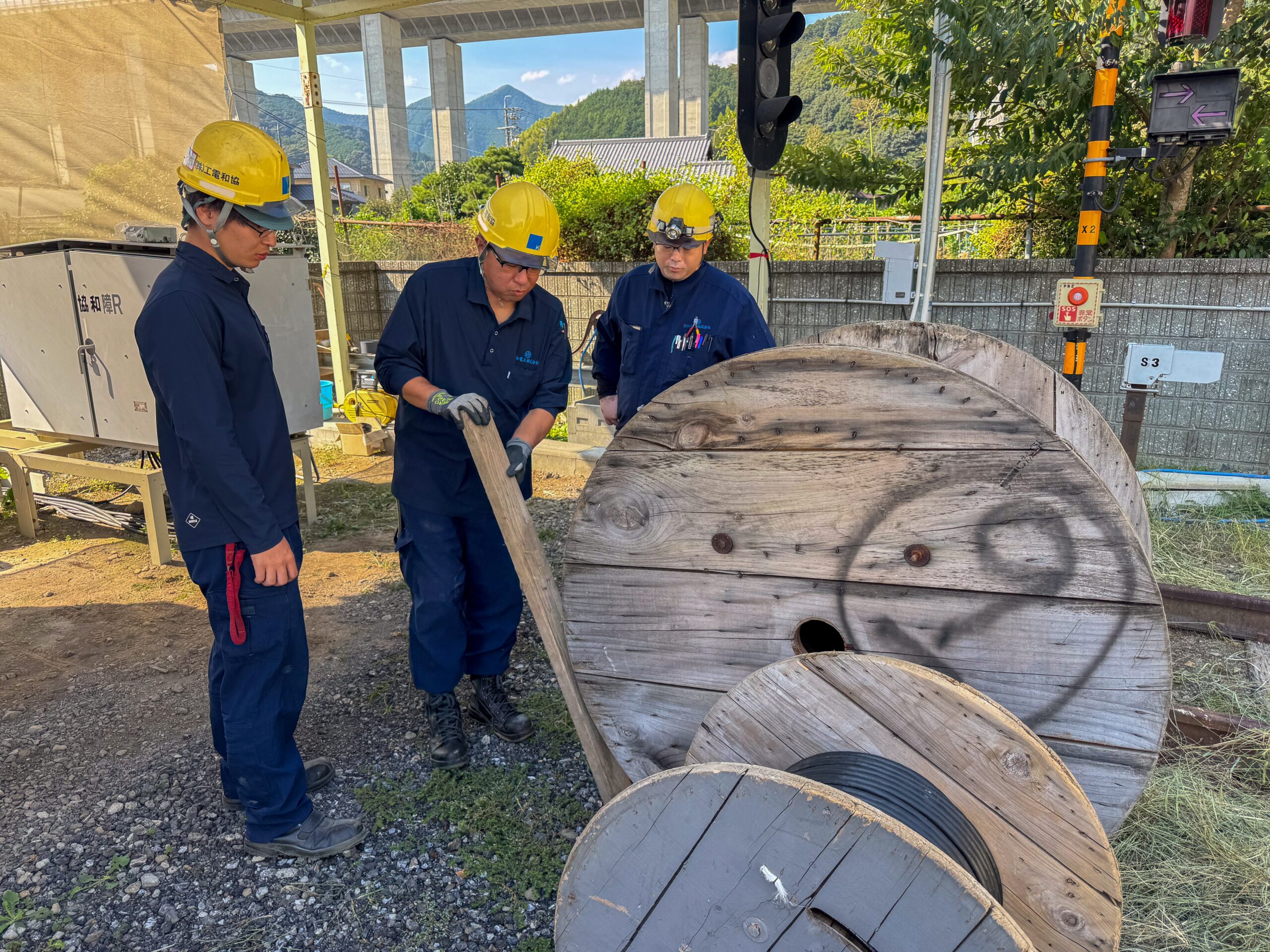 ケーブルを延線する際はドラムの軸に棒を通し、「ケーブルジャッキ」と呼ばれる工具でジャッキアップし、ドラムを回転させながら沿線を行いますが、作業員同士で声を掛け合い、注意しながら沿線を行わないとケーブルドラムが必要以上に高速回転し大変危険です。